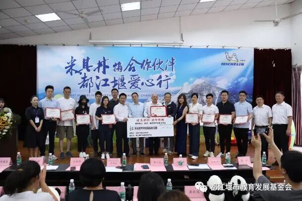 捐赠仪式中,都江堰市人民政府副市长李川虎向米其林中国区总裁、首席执行官伟书杰颁发了捐赠证书,都江堰市教育局、都江堰市教育发展基金会与都江堰市特殊教育学校向爱心单位代表颁发了捐赠证书。